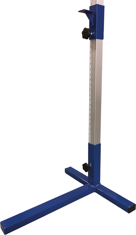 Korkeushyppyteline. Jalka ja rimanpidike jauhemaalattua terästä. Mitalla varustettu tolppa alumiinia. Rima myydään erikseen. Valmistettu Suomessa, Suomen Kenttävaruste Oy:n omalla tehtaalla Tampereella.