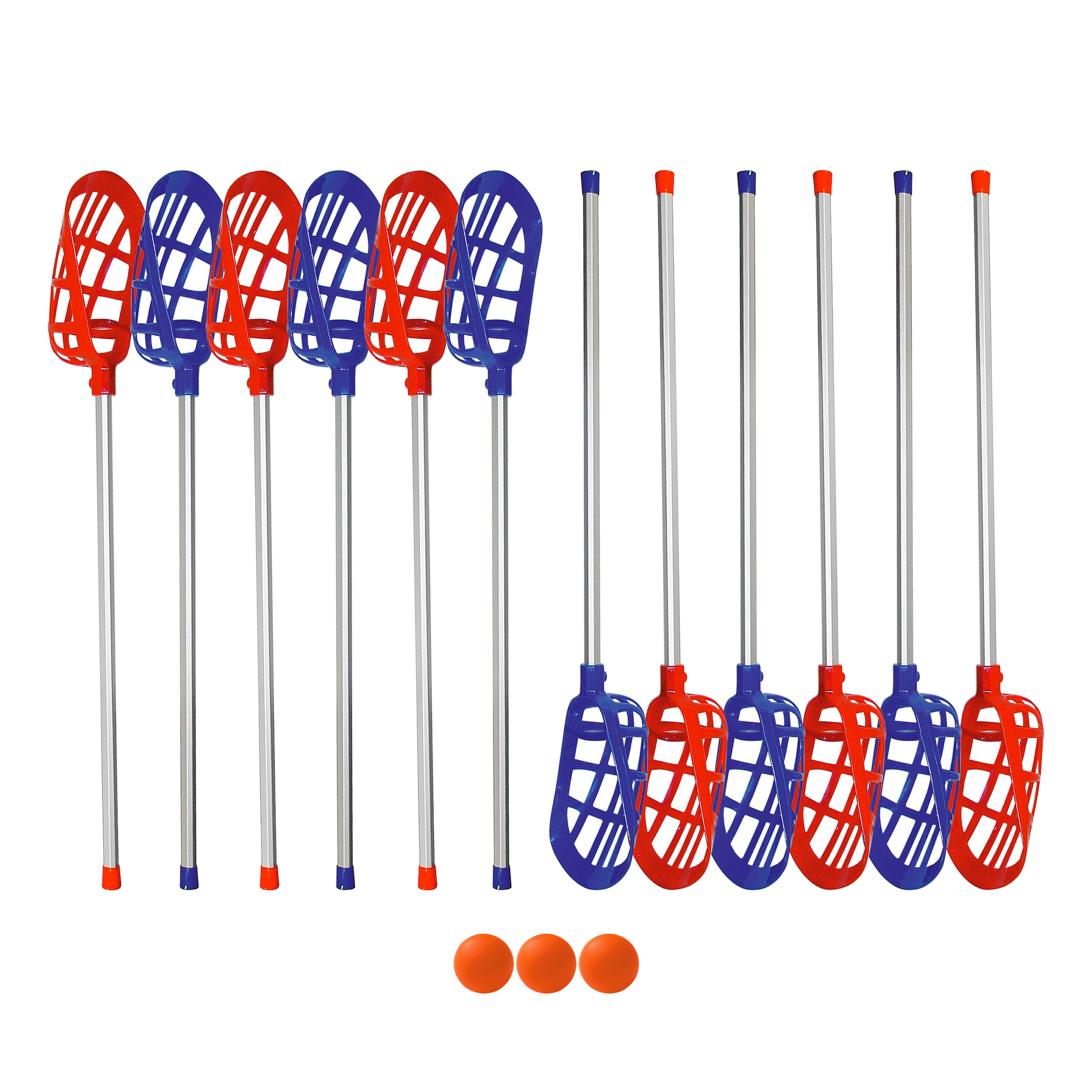 Sisä- ja ulkokäyttöön soveltuva setti kahdelle joukkueelle. Sisältää 6 punaista ja 6 sinistä mailaa sekä 3 palloa. Mailat alumiinia ja muovia.